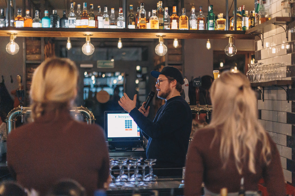 - Gyvą degustaciją bare Alaus Biblioteka sėdint prie staliuko.