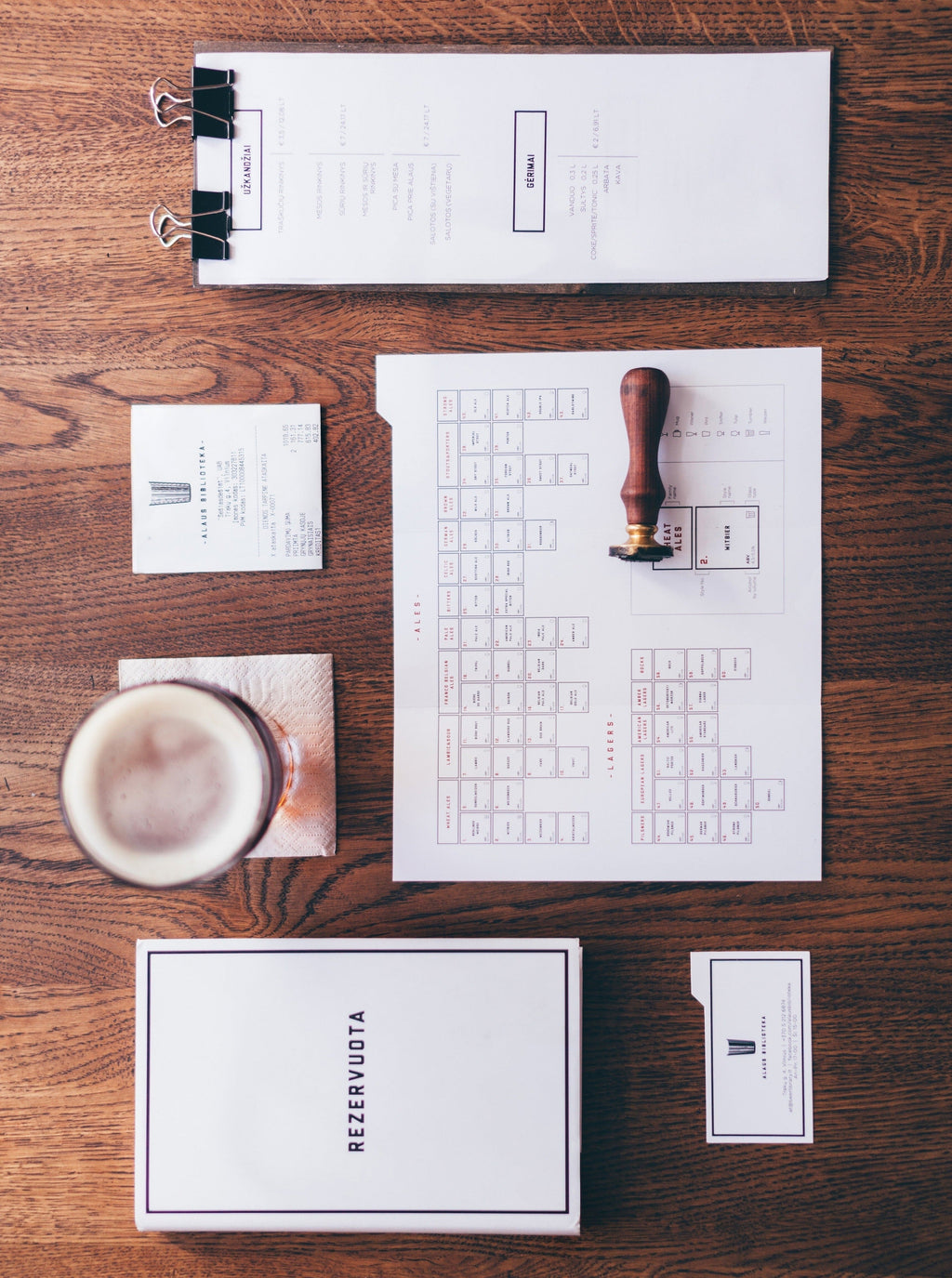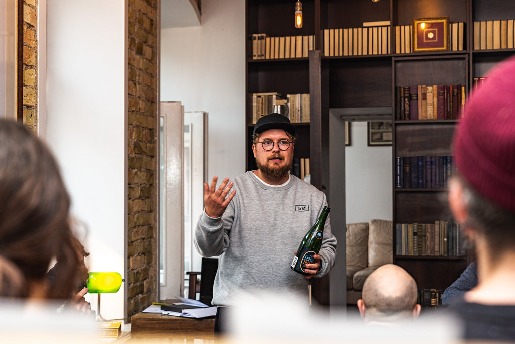 - Gyvą degustaciją bare Alaus Biblioteka sėdint prie staliuko.